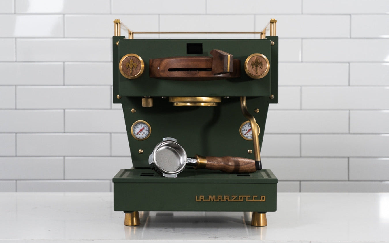 La Marzocco - Linea Mini R - Custom Dunkelgrün mit dunklem Holz & Messing Heim-EspressomaschineLa Marzocco - Linea Mini R - Custom Dunkelgrün mit dunklem Holz & Messing Heim-Espressomaschine